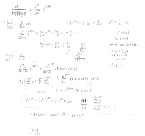 紙と鉛筆しかないときってありますよね。今日まさにそういう状況が発生したので、そういった際に私が行う様々な暇つぶしのうちの一つを紹介しようと思います 公式 $\frac{n!}{\left(\frac{n+x}{2}\right)!\left(\frac{n-x}{2}\right)!}\approx\frac{2^{n+1}}…